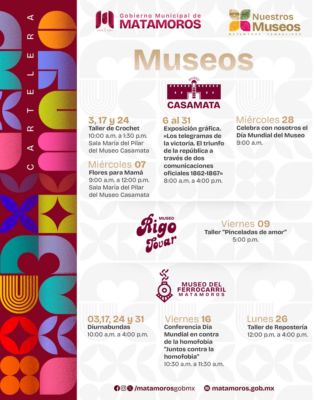 Para mayor información sobre fechas, horarios y sedes de las actividades, se recomienda consultar la cartelera oficial. El Gobierno de Matamoros espera contar con la participación de todos y hacer de este mayo un mes inolvidable para la comunidad.