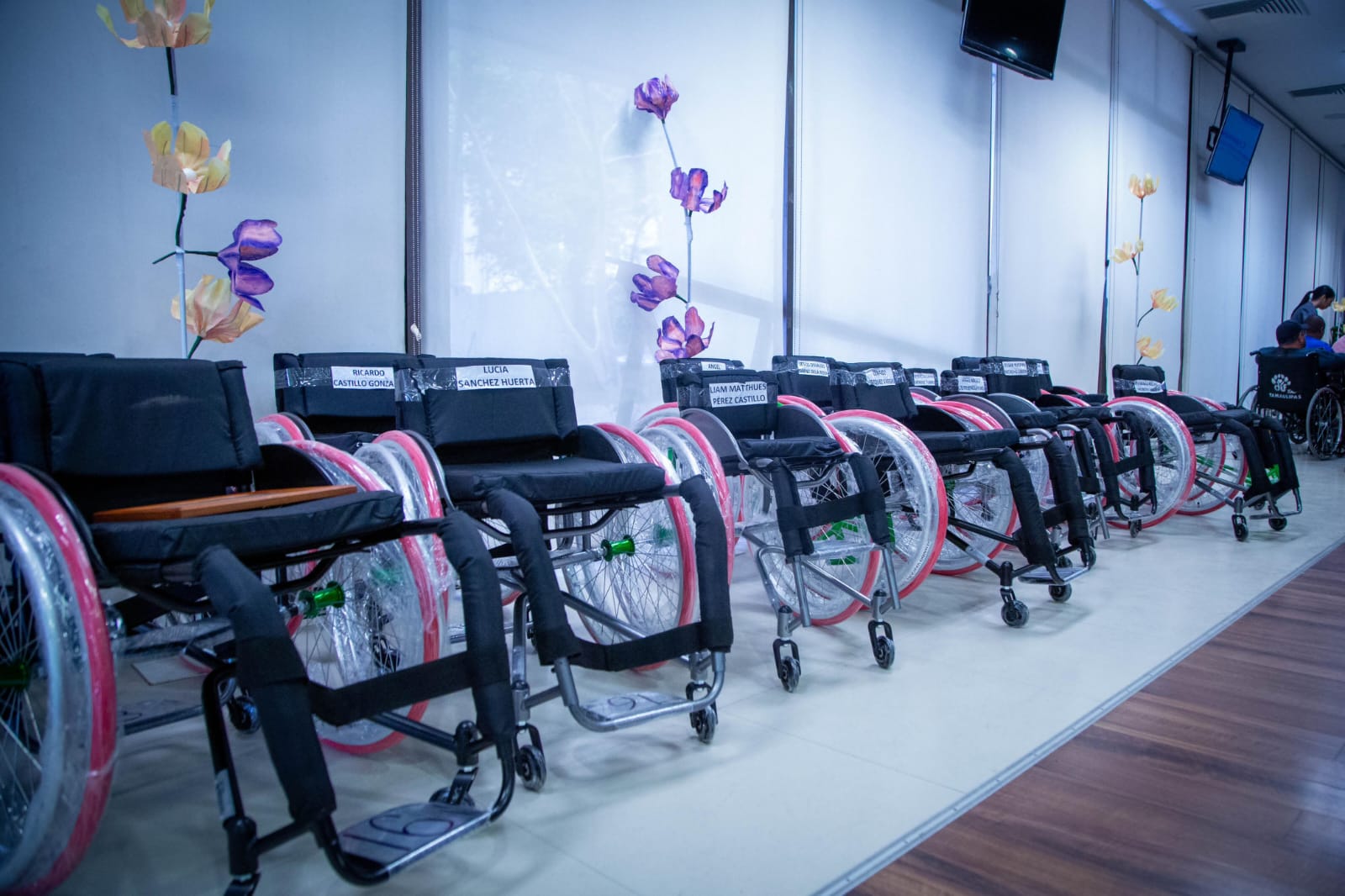 En esta ocasión se llevó a cabo la entrega de 29 sillas de ruedas activas y una silla bipedestadora, un modelo especial que permite al usuario ponerse de pie y regresar a la posición original de la silla de manera casi inmediata. Esto ayuda a evitar la aparición de llagas y permite un movimiento en el cuerpo que mejora la circulación sanguínea.