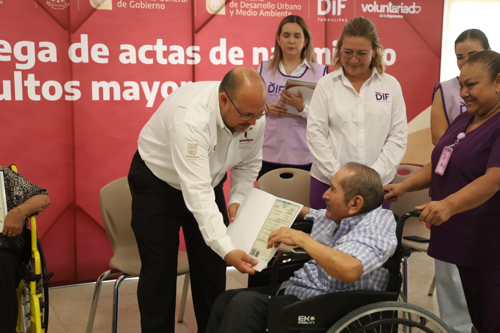 En este evento estuvieron presentes personal de la Coordinación General del Registro Civil; Lucy Luna Saeb, directora de los Centros Asistenciales del DIF Tamaulipas; María de Lourdes de la Fuente Vizcarra, subdirectora de enlace del Voluntariado y Patricia González Castillo, jefa del Departamento Administrativo en la Casa Hogar del Adulto Mayor.