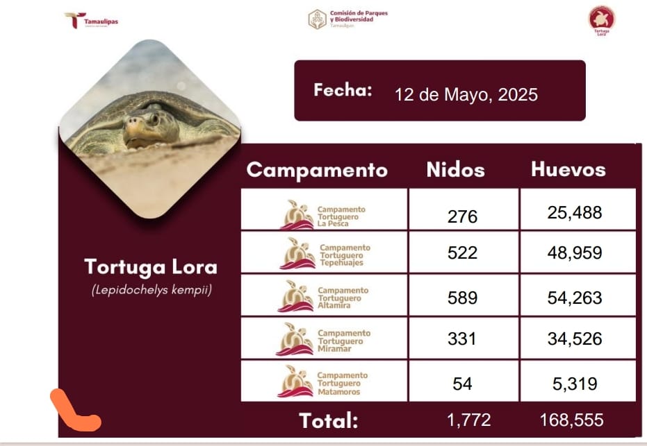 Con un incremento del 20% en el número de huevos protegidos en comparación con 2024, la Comisión de Parques y Biodiversidad del Estado reporta un arranque positivo en la temporada de anidación de la tortuga lora, que este año ha superado ya los 1 mil 772 nidos y 168 mil 555 huevos resguardados en los campamentos de La Pesca, Tepehuajes, Altamira, Miramar y Matamoros.