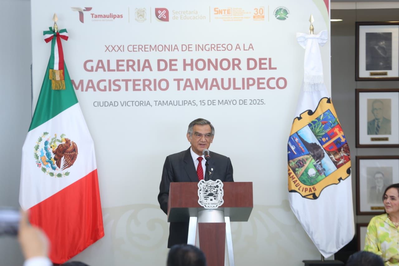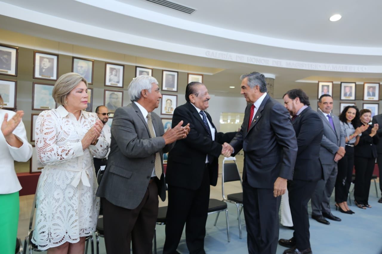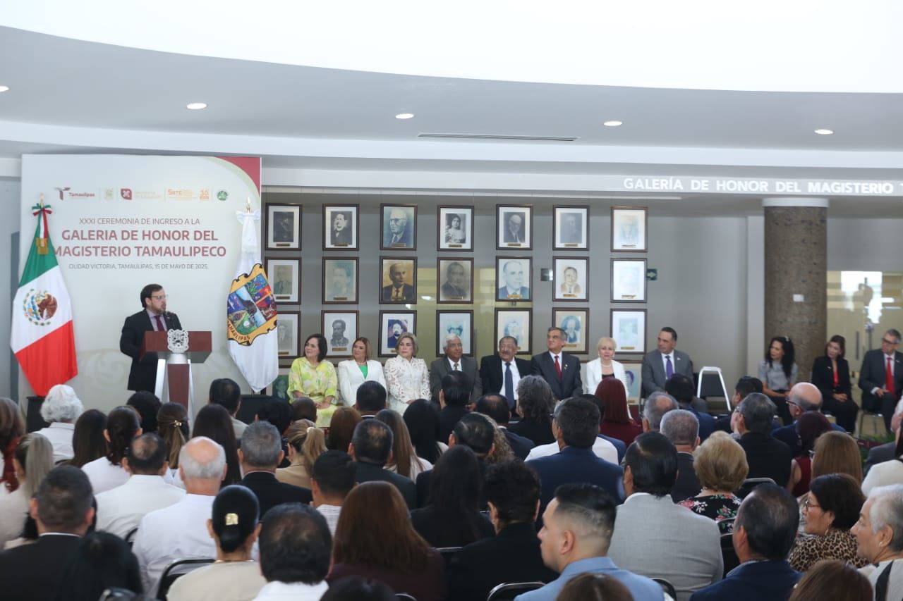 Por la mañana, en el Centro Regional de Formación Docente e Investigación Educativa (CRETAM), Villarreal Anaya presidió la ceremonia de ingreso a la Galería de Honor del Magisterio Tamaulipeco, y entregó reconocimiento y la medalla Lauro Aguirre a la galardonada de Educación Básica, doctora María de Jesús Lara Tijerina, y a la doctora Lucila Olvera Flores, galardonada de Educación Media Superior y Superior.