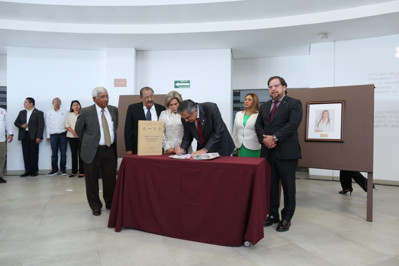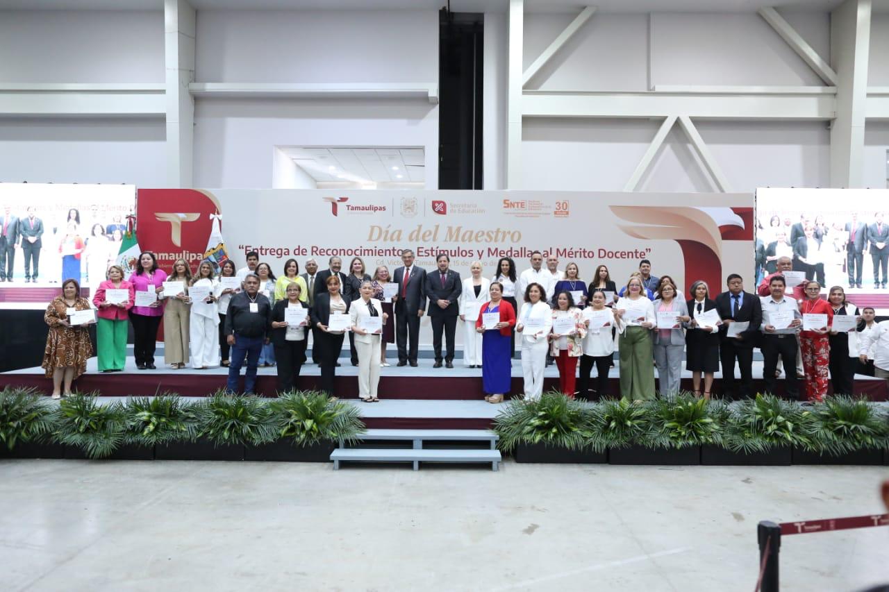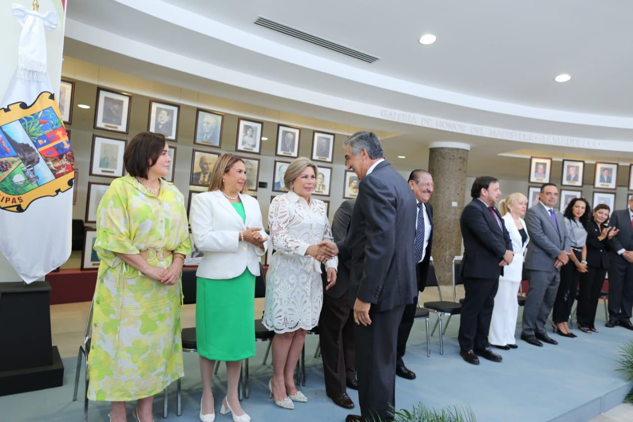 Por la mañana, en el Centro Regional de Formación Docente e Investigación Educativa (CRETAM), Villarreal Anaya presidió la ceremonia de ingreso a la Galería de Honor del Magisterio Tamaulipeco, y entregó reconocimiento y la medalla Lauro Aguirre a la galardonada de Educación Básica, doctora María de Jesús Lara Tijerina, y a la doctora Lucila Olvera Flores, galardonada de Educación Media Superior y Superior.