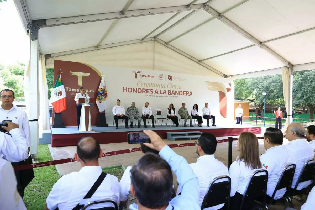Al dar la bienvenida a la ceremonia cívica de honores, la secretaria de Desarrollo Urbano y Medio Ambiente, Karina Saldívar Lartigue, enfatizó que gracias a las políticas ambientales que impulsa el gobernador Américo Villarreal, Tamaulipas avanza hacia un modelo de desarrollo más equilibrado, responsable e incluyente, con un enfoque que coloca en el centro la justicia social, el respeto por la naturaleza y la acción frente al cambio climático.