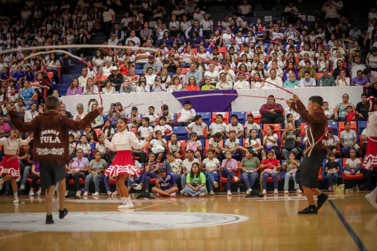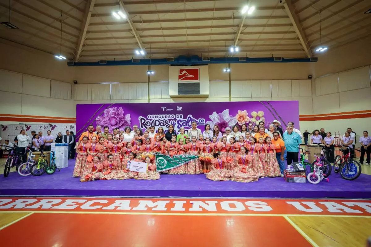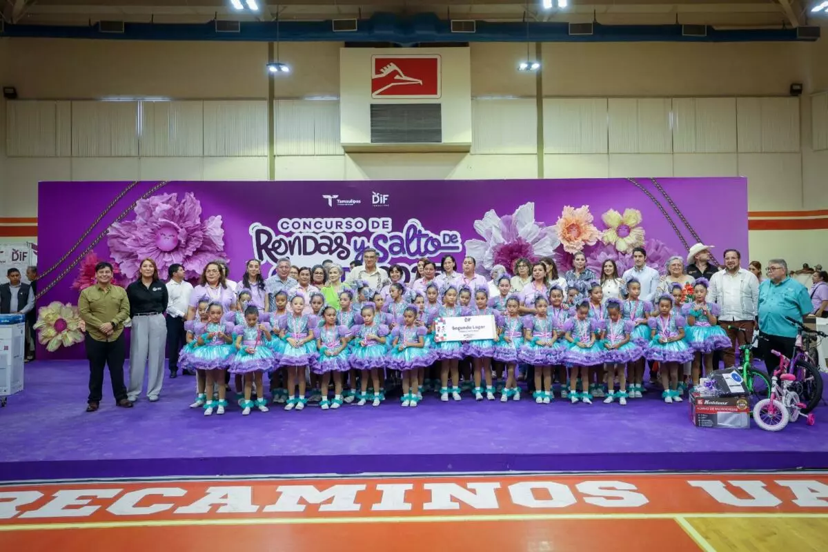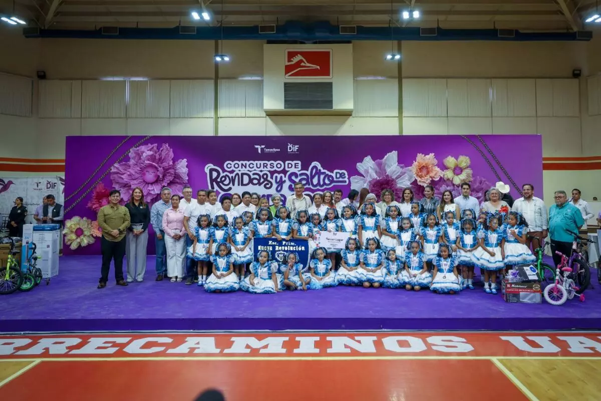 El gobernador Américo Villarreal Anaya y la presidenta del Sistema DIF Tamaulipas, la doctora María de Villarreal, premiaron a las y los ganadores de la final estatal del Concurso de Rondas Infantiles y Salto de Cuerda 2025, evento que se desarrolló en las instalaciones del Gimnasio Multidisciplinario de la UAT en esta capital, con la participación de alumnos de escuelas de las regiones norte, centro y sur del estado.