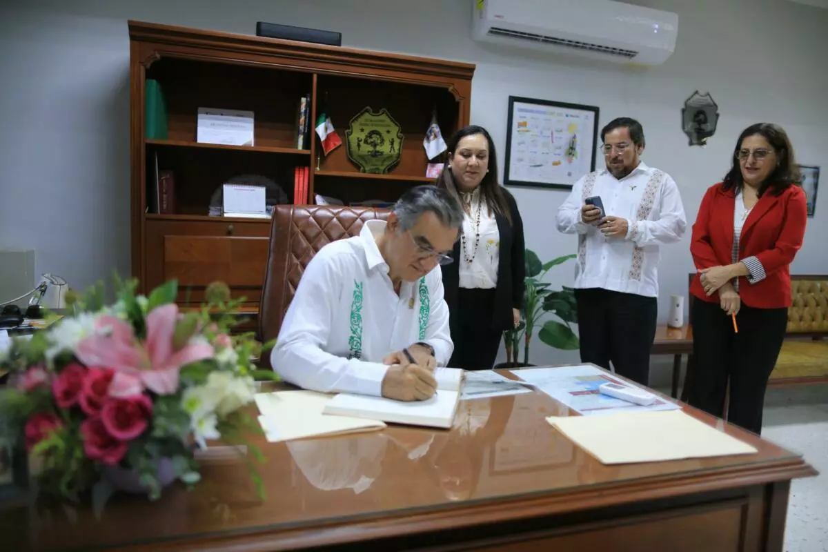Además, recorrió las instalaciones del plantel y firmó el libro de visitantes distinguidos: “Con mucho orgullo y emoción hoy acudo a secundar la obra de mis padres. A terminar el gimnasio que él inició en esta extraordinaria escuela normal, cimiento de muchos tamaulipecos ilustres sobre los cuales hoy ponemos nuestra esperanza de una mejor sociedad”, escribió.