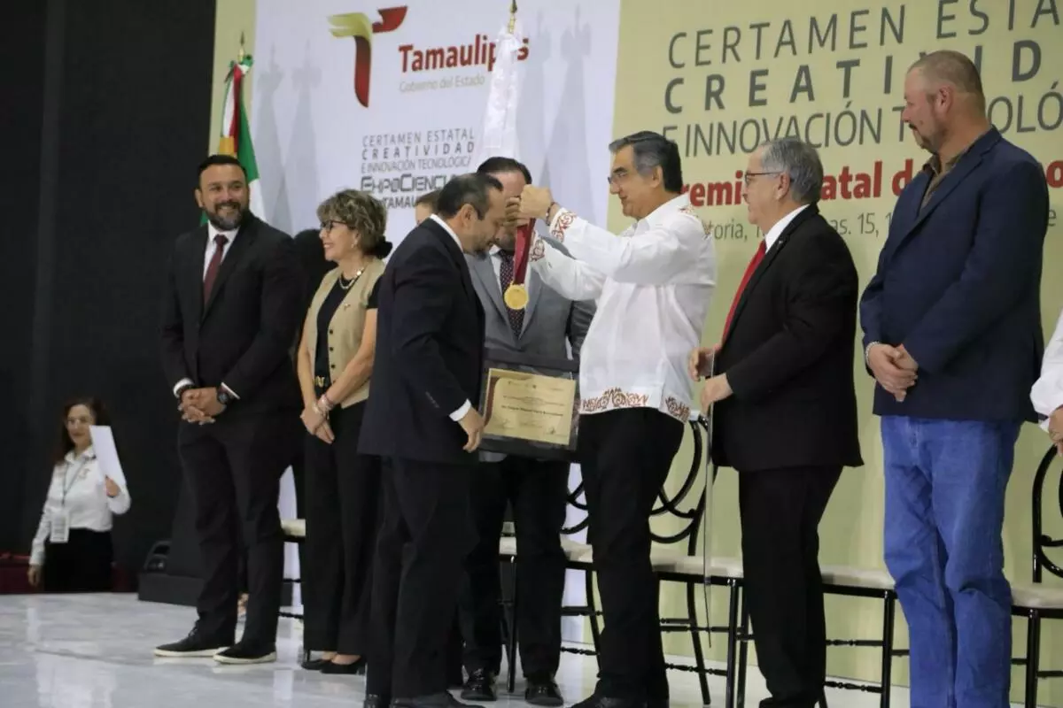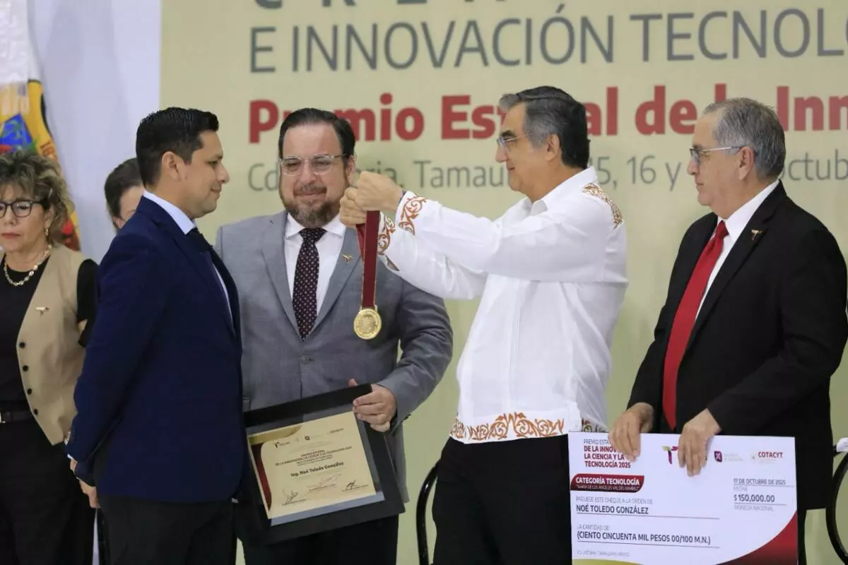 El gobernador Américo Villarreal Anaya hizo entrega de la Medalla “Ramiro Iglesias Leal” al ganador del Premio Estatal de la Innovación, la Ciencia y la Tecnología 2025 en la categoría de Innovación, el Dr. Edgar Tello Leal de la Facultad de Ingeniería y Ciencias de la Universidad Autónoma de Tamaulipas; de la Medalla “Ruy Pérez Tamayo”, al ganador en la categoría de Ciencia, el Dr. Gaspar Manuel Parra Bracamonte del Centro de Biotecnología Genómica del Instituto Politécnico Nacional, y en la categoría de Tecnología, la Medalla “María de los Ángeles Valdés Ramírez”, al Dr. Noé Toledo González de la Universidad Tecnológica de Matamoros.