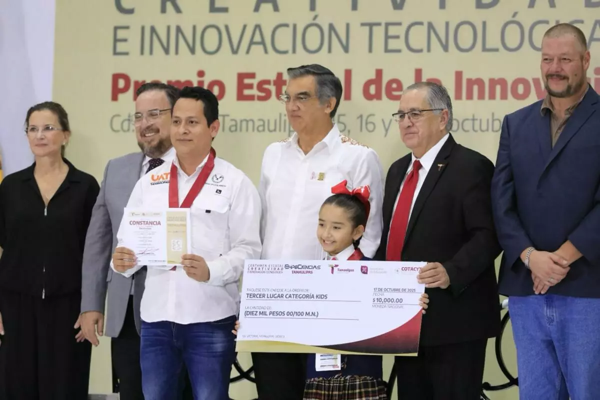 En lo que se refiere el Certamen Estatal de Creatividad e Innovación Tecnológica, resultaron ganadores de primer lugar, Categoría Pioneros de la Ciencia Petit, “Aspiradora” de Diego Eduardo Garza Telcalco del Colegio Royal de Nuevo Laredo; Categoría Pioneros de la Ciencia Kids, “Reji Duo” de Alicia Gómez González, del Colegio Tamaulipas en Nuevo Laredo; Categoría Pioneros de la Ciencia Juvenil, “Sistema de Separado de Grasas para la Prevención del Tapado de Drenajes” de Heimy Naomi Ochoa Granados de la Escuela Secundaria General “Belisario Domínguez” en San Fernando.