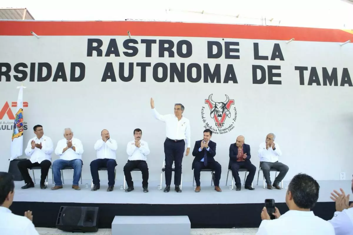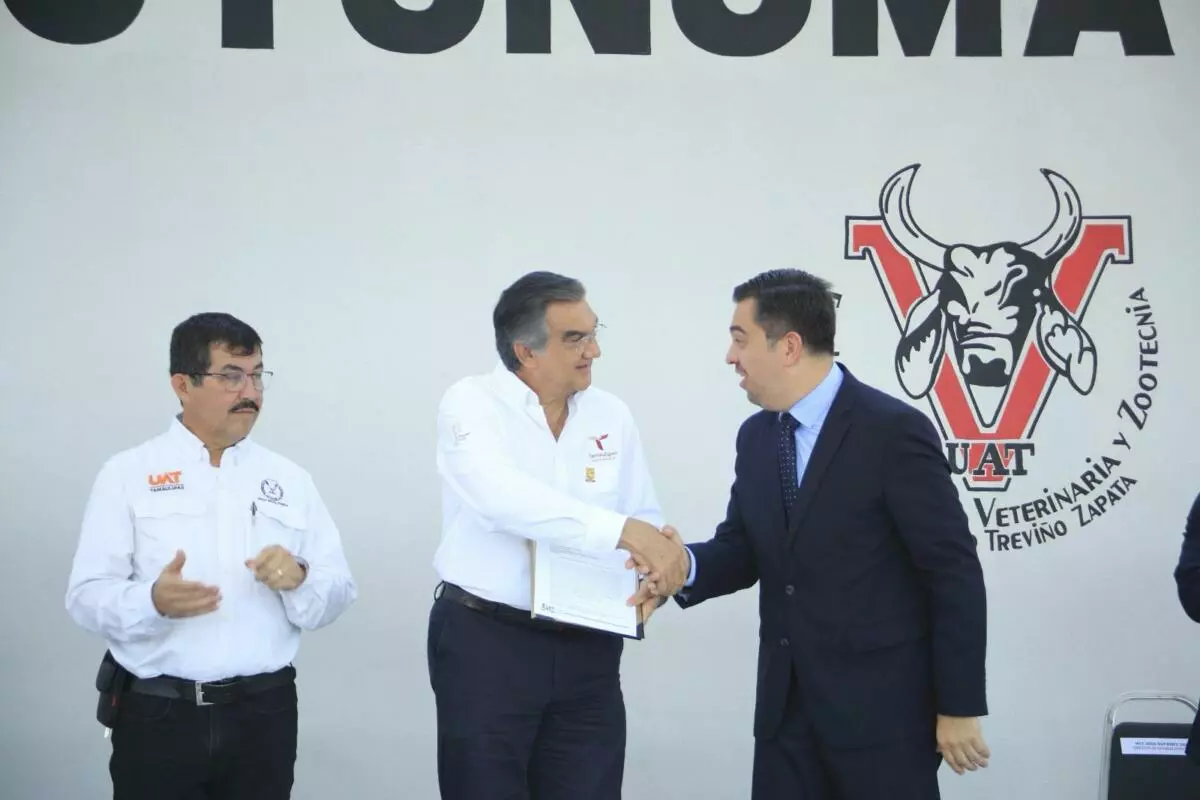 Acompañado por el rector de la UAT, Dámaso Anaya Alvarado, y dirigentes del sector ganadero del estado, el gobernador recibió de manos de Leandro David Soriano García, director general de Inocuidad Agroalimentaria, Acuícola y Pesquera del Senasica, el documento que permite la actividad diaria de la sala de corte y deshuese para la especie bovina, cámara de producto terminado, almacén, empaque y andenes de carga y descarga en el rastro ubicado en la Facultad de Medicina Veterinaria y Zootecnia, en esta capital.