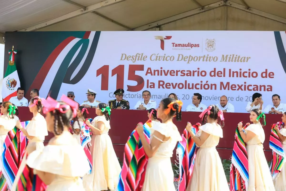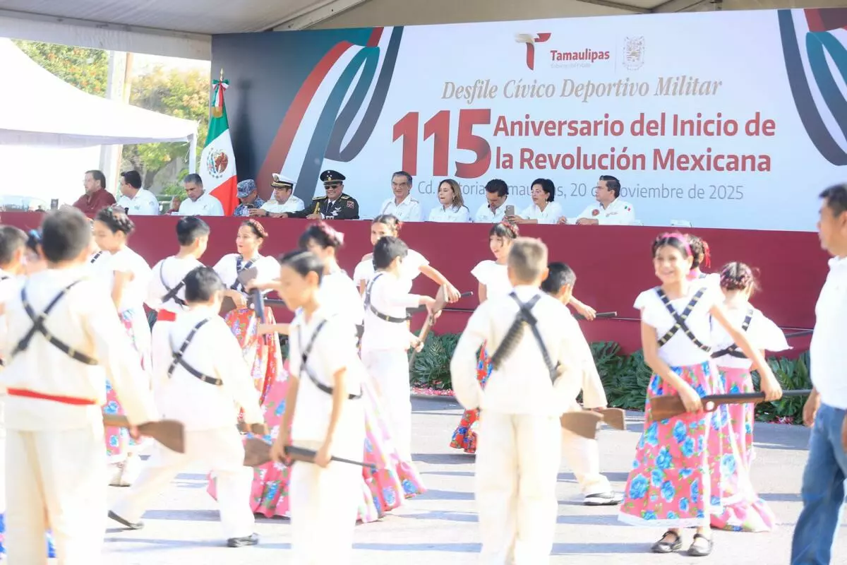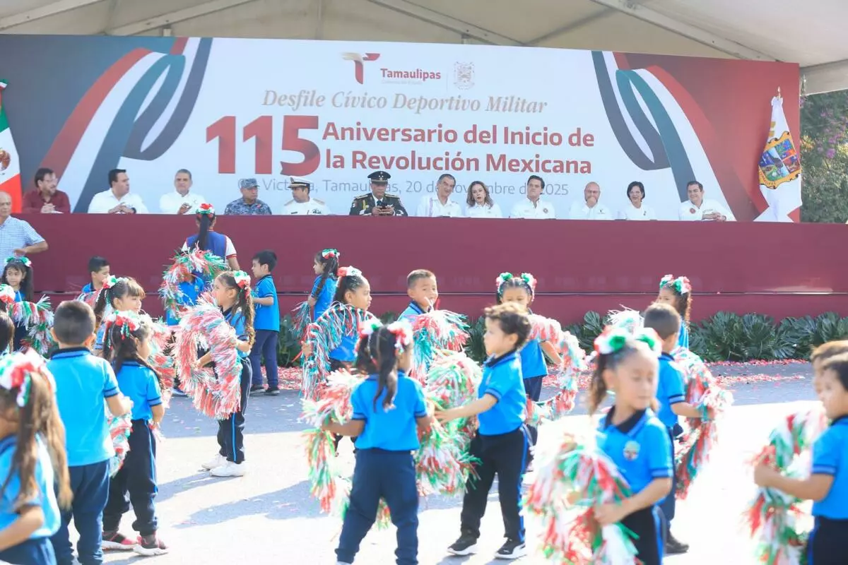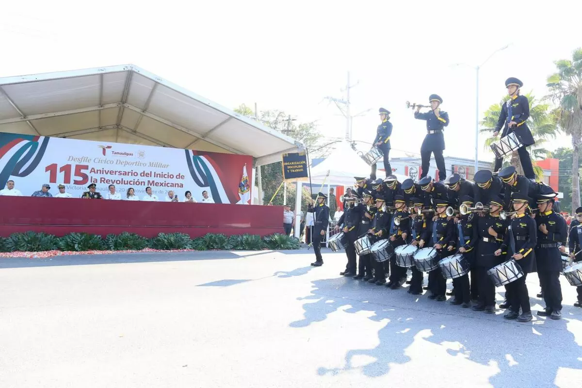 Con la presentación, por primera vez, de una banda de guerra monumental integrada por 500 alumnos y alumnas de diferentes municipios, este jueves se conmemoró el desfile cívico, deportivo y militar, con la entusiasta participación de estudiantes, jóvenes, niñas y niños, en conmemoración del 115 aniversario del inicio de la Revolución Mexicana, presidido por el gobernador Américo Villarreal Anaya.