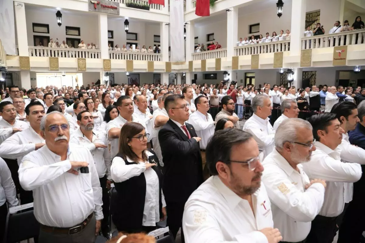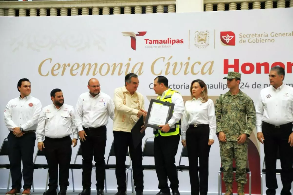 Tras la proyección de un video donde la directora de Protección Civil de Veracruz, Guadalupe Osorno, a nombre de la gobernadora Rocío Nahle da un reconocimiento al pueblo de Tamaulipas, por las labores de auxilio prestadas, el mandatario entregó litografías enviadas por la gobernadora al capitán Marcelo Israel Peña y al técnico auxiliar Fidel Eduardo Castro.