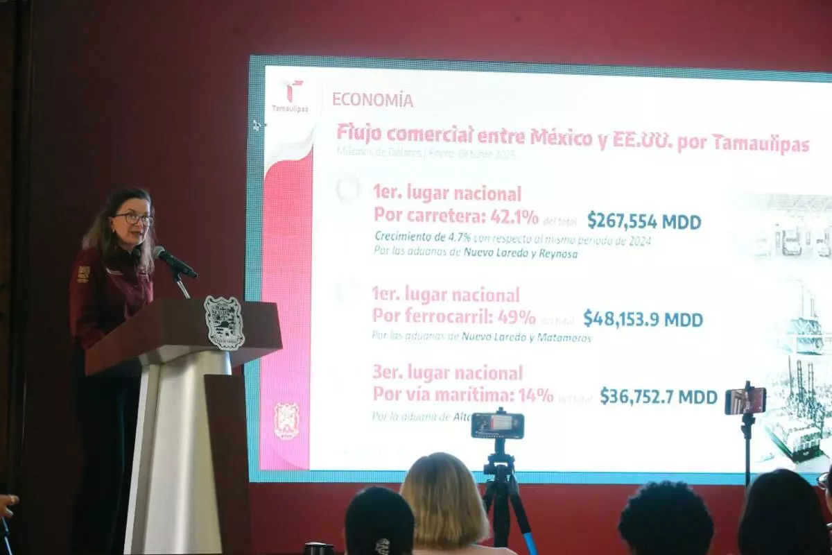 En su intervención la secretaria de Economía, Ninfa Cantú Deándar destacó que Tamaulipas es el sexto estado exportador de México con 27,871.2 millones de dólares, con un crecimiento de 6.4% y además dio a conocer otros indicadores que sitúan a Tamaulipas entre los estados con mejor crecimiento, con un aumento de 2.5% del PIB en 2024; un incremento de 12.2% en el indicador de la actividad industrial, en primer lugar nacional, además de un aumento de 46.8 por ciento de inversión extranjera directa en 2025 y 3.1% de aumento en la actividad económica estatal, ocupando también el primer lugar nacional con un 4.7% de aumento en el comercio carretero con Estados Unidos y 5.2% de crecimiento real en el salario registrado ante el IMSS.