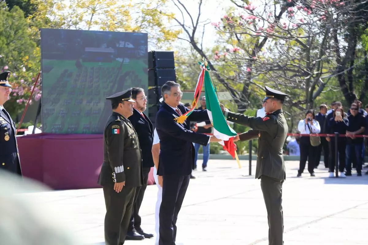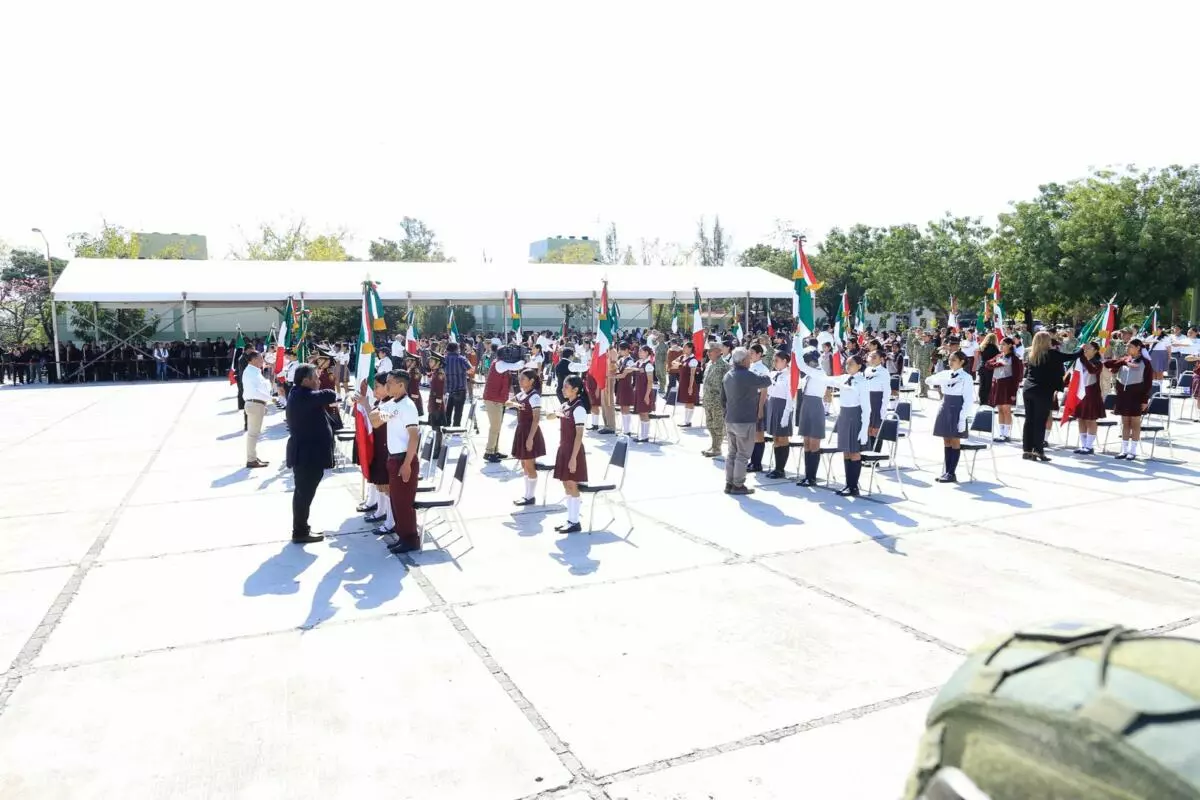 Durante el evento cívico, que incluyó un enlace con la ceremonia encabezada por la presidenta Claudia Sheinbaum Pardo, y en el cual también se izó la bandera del Cerro del Aura, el mandatario estatal, quien hizo entrega del lábaro patrio para su guarda y custodia a cinco escuelas, reafirmó el compromiso de las nuevas generaciones con los valores y símbolos patrios.