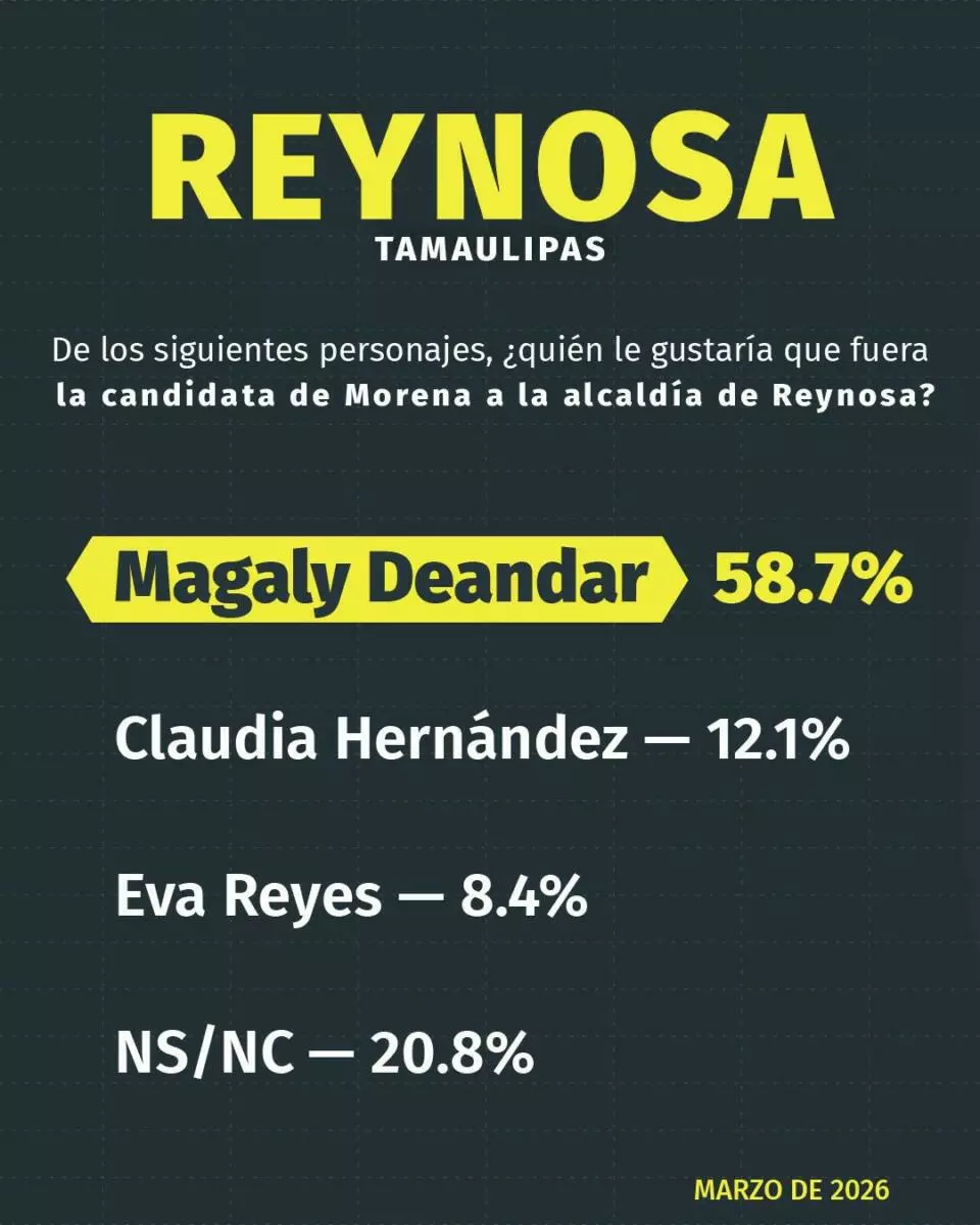 Un estudio de opinión realizado por la firma DatoMetría coloca a la diputada local Magaly Deándar como la aspirante mejor posicionada de MORENA rumbo a la alcaldía de Reynosa en 2027.