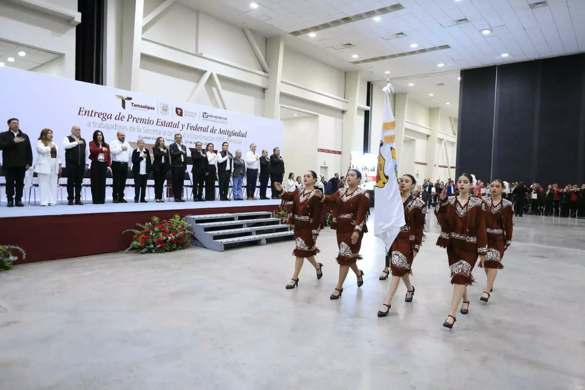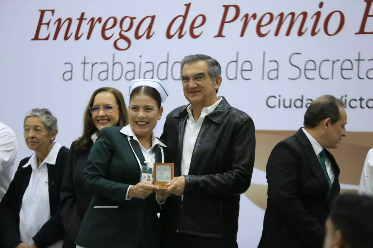 Acompañado por Marggid Rodríguez Avendaño, coordinador de IMSS-Bienestar en Tamaulipas y dirigentes sindicales, el jefe del Ejecutivo entregó 37 premios de antigüedad, de un total de 1,400 a personal de salud, destacando por 60 años de servicio, Almarcelia Cárdenas Guardado, enfermera general titulada «B», del Distrito de Salud para el Bienestar I, en Ciudad Victoria.