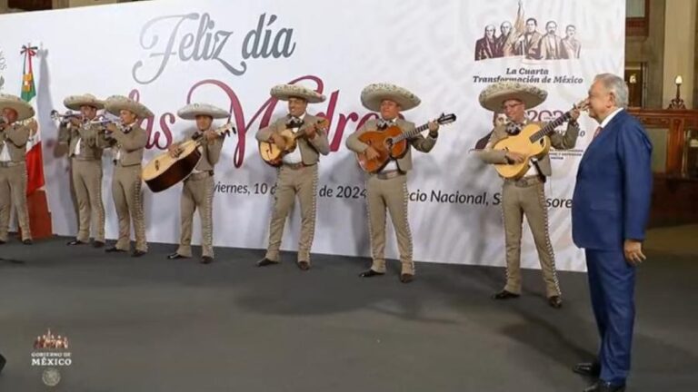 Con todo y mariachi y un ramo de flores, el presidente Andrés Manuel López Obrador festejó este viernes el Día de las Madres en Palacio Nacional. «Felicidades a todas las mamás de nuestro país y de otros países, a las mamás que se nos adelantaron, pero como vamos a decirlo en una canción, hay amor eterno para todas ellas, y para las mamás que están con nosotros, mamás, abuelitas, a todas, muchas felicidades», indicó el mandatario federal. Asimismo, el presidente López Obrador informó que la tradicional ronda de preguntas y respuestas se suspende por este día, sin embargo, el lunes la conferencia matutina se llevará a cabo con normalidad. «Esta ‘mañanera’ comienza con ‘Las mañanitas’ y vamos a llevar a cabo este homenaje a las madres, nada de polÍtica, nada de preguntas y respuestas, el lunes ya vamos a ponernos al corriente, pero ahora es para las mamás, amor, amor, amor», expresó el jefe del Ejecutivo. Como parte de la conmemoración, el presidente AMLO presentó el grupo de mariachi Son de México para cantarle a las mamás de México. “Hasta que te conocí”, “Te lo pido por favor”, “Querida”, “Amor eterno” de Juan Gabriel deleitaron a las mamás así como periodistas presentes. Continuaron con “Cariño que Dios me ha dado” de Cuco Sánchez, “Gema” de Javier Solis, “Perdón” de Pedro Flores, “En tu pelo” de Javier Solís y por último cerraron con la canción “Entrega total”, también de Javier Solís.