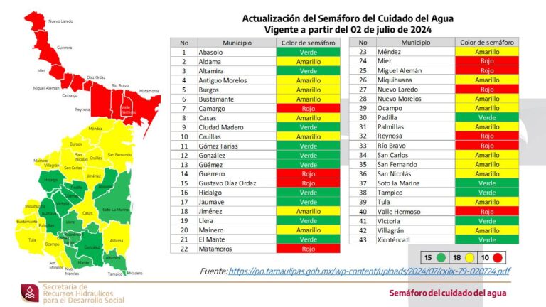 Actualizan Semáforo del Agua para julio en Tamaulipas